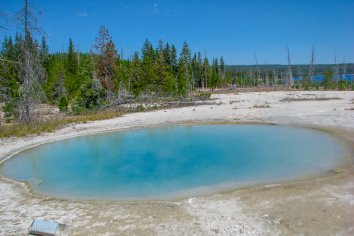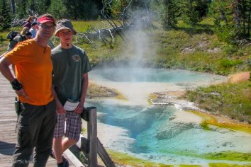 Heute heißt es nun Abschied nehmen vom Yellowstone Park — die großen Tetonen warten auf uns. Ein letztes Mal kommen wir auf unserer Weiterfahrt an einem Geysirbecken vorbei: dem West Thumb.