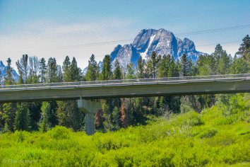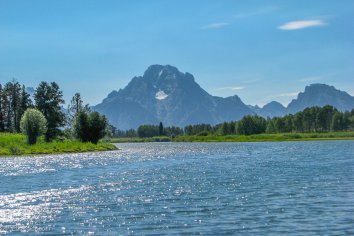 Am frühen Nachmittag kommen wir dann im Grand Teton Nationalpark an. Die höchsten Berge sind hier über 4000 Meter hoch — der höchste ist der Grand Teton mit 4197 Metern — und schon kurz nach dem Parkeingang gibt es die ersten Viewpoints, von denen man eine tolle Aussicht auf die schneebedeckten Zacken der Tetons hat.