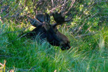 Wir fahren am Ufer des Jackson Lake entlang und sehen kurz vor der Jackson Lodge am Straßenrand einen jungen Elchbullen, der sich in den kühlen Schatten zurückgezogen hat und ein Nickerchen hält.