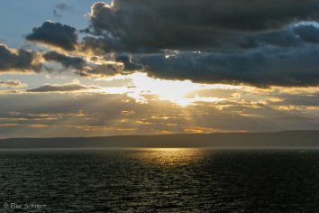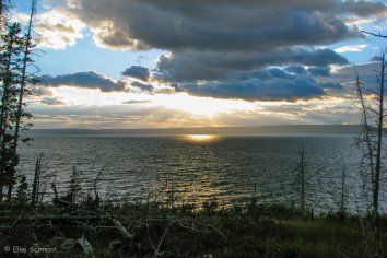 Gegen 20:00 Uhr kommen wir dann endlich am Lake Yellowstone an. Es weht eine steife Brise und die ersten dampfenden und nach Schwefel riechenden Löcher erinnern uns sogleich daran, dass wir uns quasi mitten im Krater eines Riesen-Vulkans befinden. Die Gesamt-Caldera hat eine unvorstellbar große Grundfläche von 55 x 80 Kilometer.