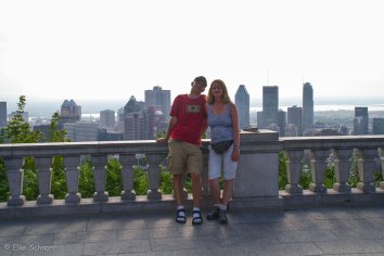 Am Parklatz in der Voie Camilien-Houde lassen wir das Auto stehen und laufen den Rundweg zum Chalet du Mont-Royal. Von hier hat man eine tolle Aussicht über Montréal. Bei klarem Wetter soll man bis zu den Adirondacks — unserem nächsten Reiseziel — sehen können, heute ist es aber leider ziemlich diesig.