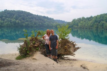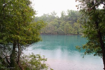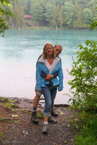 Die beiden türkisfarbenen Seen, die durch die letzte Eiszeit entstanden sind, haben wunderbar klares Wasser und sind über 60 Meter tief. Am Nordufer gibt es einen Badestrand mit Picknick- und Grillplätzen und trotz des nicht unbedingt optimalen Wetters herrscht dort zum Sonntag schon reger Betrieb.