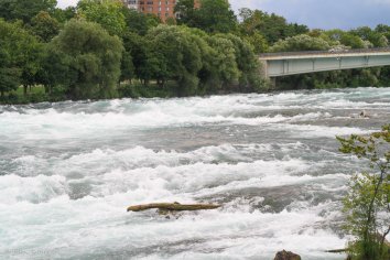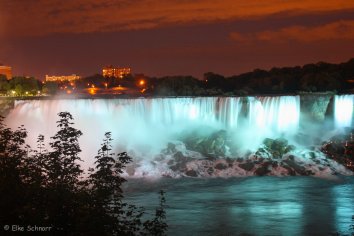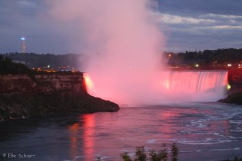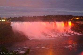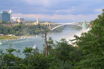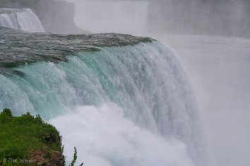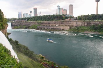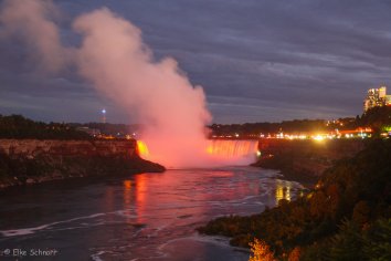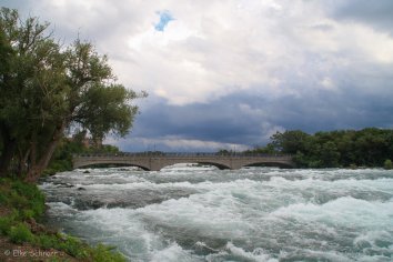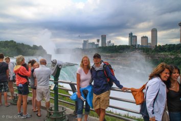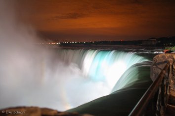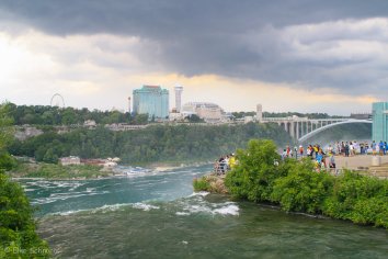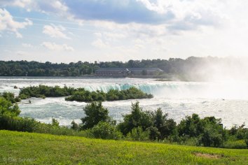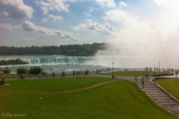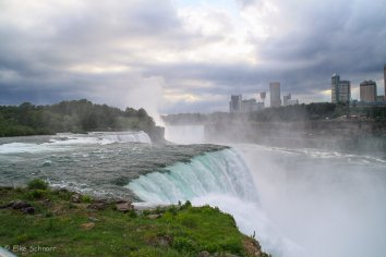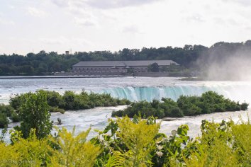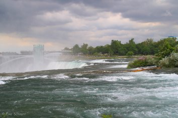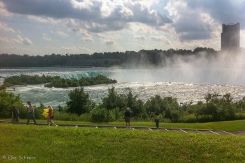 Die kanadische Seite soll ja eigentlich die deutlich bessere Wahl sein, wenn man die Fälle besichtigen will. Aber selbst hier sind wir bereits mächtig beeindruckt. Mit donnerndem Getöse stürzen die Wassermassen des Niagara — immerhin 170 Millionen Liter pro Minute! — über eine 58 Meter hohe Geländestufe und trotz des nicht optimalen Wetters und Lichtes können wir einfach nicht anders: wir knipsen was das Zeug hält