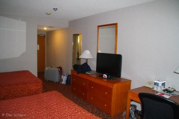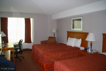 Wir checken im Ramada ein und beziehen unser Zimmer. Für das Parken am Hotel müssen wir heftige 12 CAD pro Tag bezahlen — bei unserem späteren Rundgang sehen wir allerdings viele Parkplätze, wo man sein Auto bereits für 5 CAD den ganzen Tag stehen lassen kann.