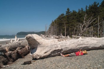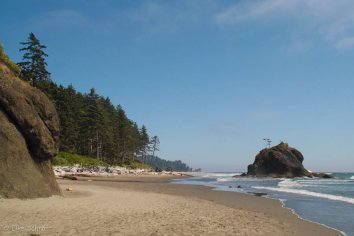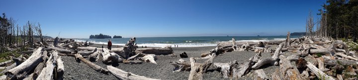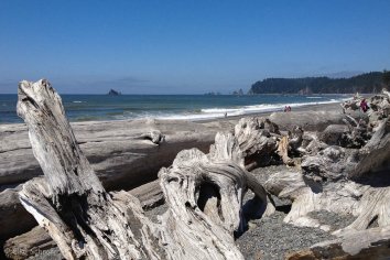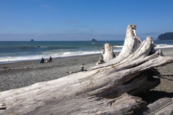 Der Rialto Beach ist vom Parkplatz aus recht leicht zugänglich und gefällt uns richtig gut: von der Witterung ausgebleichtes Treibholz, aus dem Wasser ragende Felstürme und ein strahlend blauer Himmel geben eine perfekte Kombination ab.