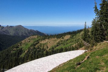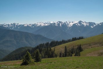 Die Straße schlängelt sich in endlosen Serpentinen in die Höhe und oben angekommen, bietet sich uns ein phantastischer Blick auf die schneebedeckten Gipfel des Olympic NP.