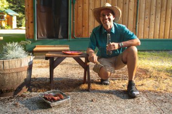 Ganz so hatten wir uns das zwar nicht vorgestellt, aber nachdem wir eine Weile entspannt haben und die Sonne und die Ruhe auf einer Bank vor unserer Cabin genossen haben, bringen wir diesen Grill auch zum Fliegen und es gibt Burger und Steaks.