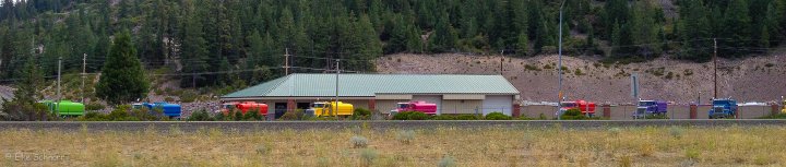 Und an einer Raststätte bietet sich uns dieses nette Bild von bunten Trucks. Als ob sie sich abgesprochen haben, bevor sie sich hier in Reihe und Glied farblich gut sortiert aufgestellt haben