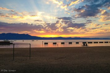 Kurze Zeit später kommen wir dann am Lake Tahoe an — einem der schönsten Berg-Seen der USA. Mit seiner tollen Wasserqualität ist er ein echtes Wassersport-Paradies und durch seine Lage auf knapp 2000 Meter Höhe natürlich auch ein Top Ski-Gebiet.