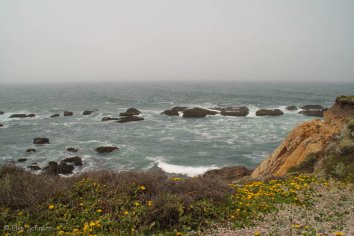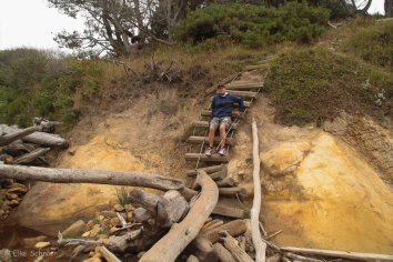 So treffen wir schon gegen 9:00 Uhr am Trailhead zum Bowling Ball Beach ein. Über eine steile und wackelige Holztreppe klettern wir nach unten zum Beach und laufen dann einen knappen Kilometer am Strand entlang, um zu den Bowling Balls zu gelangen. Diese sind aber leider schon zum großen Teil unter Wasser, denn unser Timing bzgl. Ebbe und Flut ist hier nicht so optimal.