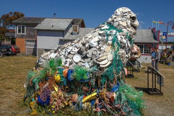 Dabei bewundern wir auch diese Kunstwerke, in denen allerlei ungewöhnlich Materialien verbaut sind — z.B Badeschuhe.