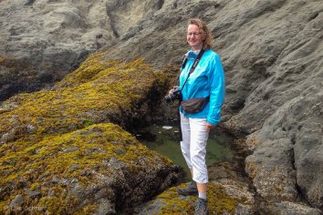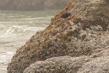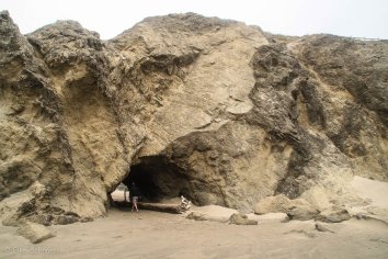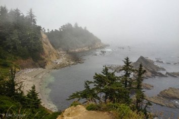 Später gehen Andreas und ich noch zum Coquille Point Viewpoint. Kaum haben wir die schützende Bucht am Webers Pier verlassen, drückt der Nebel wieder herunter. Wir lassen uns davon aber nicht abhalten und und spazieren eine Stunde am Strand entlang. Viel sehen wir nicht, aber immerhin ein paar Oystercatcher, ein paar Tide Pools und einen Arch.