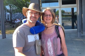 Nach dem obligatorischen Startfoto geben wir unser Gepäck an einem nahezu leeren Lufthansa-Schalter ab.