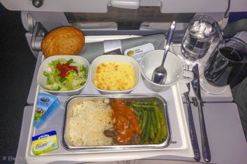Und als dann das erste Essen kommt (es gibt Chicken oder Beef, wobei wir beide letzteres nehmen) sind wir regelrecht platt: es gibt echte Gläser und das Essen ist richtig lecker ![]()