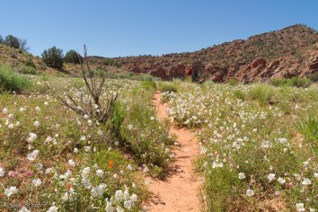 Eine Zeitlang geht es auch wirklich gut, wir genießen den Trail, erfreuen uns an den zahllosen wunderhübschen Blümchen und der tollen Aussicht und hoffen, dass die Sonnencreme was taugt, denn sie muss heute bei strahlend blauem Himmel wieder Schwerstarbeit leisten.
