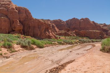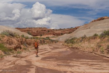 Wir stecken am Parkplatz unseren Obulus in den dafür vorgesehenen Umschlag, schnüren die Wanderschuhe, füllen die Camelbaks und marschieren los. Der Weg ist eigentlich sehr einfach — ohne merkliche Höhenmeter geht es immer am Wash entlang, den wir mehrfach queren müssen. Das wird dann auch zur Herausforderung des Tages, denn der Wash führt Wasser — eine dicke Schlammbrühe — und der gesamte Uferbereich ist glitschig wie Schmierseife.