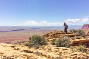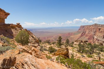 Wir laufen noch ganz nach vorn bis zum Rim — trotz relativ trüber Sicht können wir bis zu den letzten Ausläufern des Grand Canyon schauen.