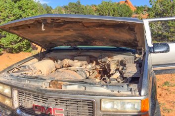 Als wir schließlich von hier weiter fahren wollen, gibt es eine ungeplante Panne: der Motor von Dallas’ Jeep weigert sich anzuspringen.
