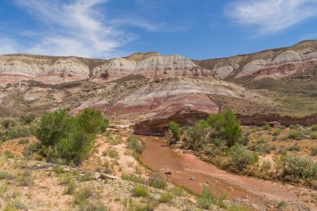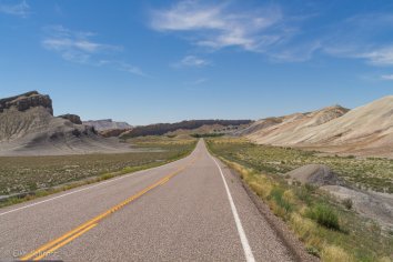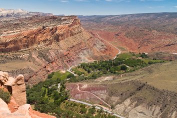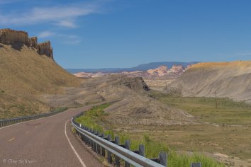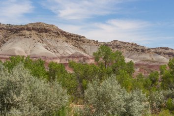 Die Landschaft unterwegs wird immer interessanter und bunter: Badlands in ständig wechselnden Farben und davor schlängelt sich der Fremont River entlang — das schaut einfach toll aus.