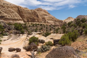 Der Trail gefällt uns auch total gut — er hat etwas von „Red Rock meets Lava“: überall liegen überdimensionierte schwarze Murmeln aus vulkanischen Basalt herum und die Felsen haben faszinierende Farben und Musterungen — fast ein bisschen wie am Yellow Rock. Und nach der Abzweigung des Hickman-Bridge-Trails, auf dem doch recht viele Leute unterwegs sind, sind wir auch nahezu alleine und können die tolle Landschaft genießen.