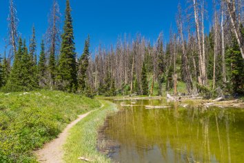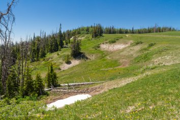 Die Landschaft ändert sich unterwegs gewaltig. Kein roter Stein mehr weit und breit, dafür blühende Alpenwiesen, Wälder, idyllische Seen und kleine Bäche — was für ein Kontrast zum Bryce Canyon, in dem wir eben noch waren…