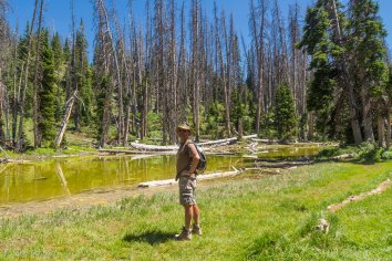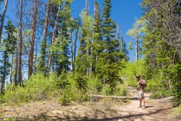 Im Park laufen wir dann eine Runde auf dem Alpine Pond Trail. Hier riecht es total gut nach frischem Holz und der kurze Weg gefällt uns richtig gut. Was allerdings auffällt, sind sehr viele tote Bäume unterwegs. Wie wir später im Visitor Center von einem Ranger erfahren, ist dafür eine Art Borkenkäfer verantwortlich. Etwa alle 300 Jahre gibt es von diesen Käfern hier eine extreme Massenpopulation, die zu einem großen Baumsterben und zur Erneuerung des Waldes führt. Die letzte begann 1992, ist aber mittlerweile fast vorüber und die neuen Bäume sehen alle recht gesund aus.