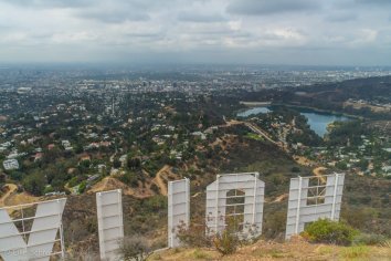 Kurz vor dem Gipfel teilt sich die Straße. Wir laufen zunächst weiter nach oben, wo der Weg unmittelbar hinter den 15 Meter großen Lettern des berühmten Schriftzuges endet. Ganz heran kommt man allerdings nicht an die Buchstaben: sie sind eingezäunt und werden durch Kameras und Zugangskontrollen überwacht, die automatisch die Polizei informieren.