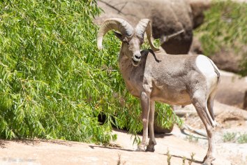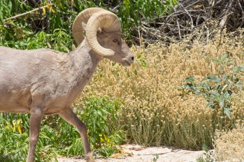 Dieses Glück haben wir jetzt im Juni natürlich nicht: alles ist knochentrocken. Aber dafür entdecken wir im Damm drei Big Horn Sheeps, die sich genüsslich an den Sträuchern zu schaffen machen und sich von uns in keinster Weise stören lassen.