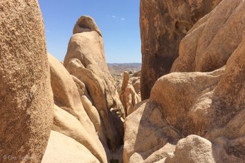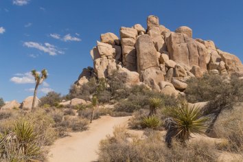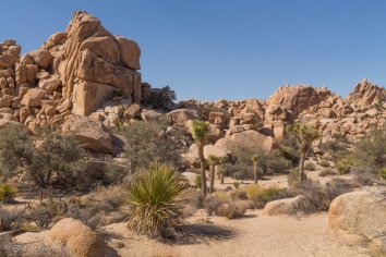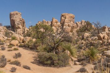 Der Hidden Valley Trail führt uns dann auf einem Loop durch den Talkessel an vielen interessanten Gesteinsformationen vorbei, die mit wunderschönen Kakteen, Joshuas und Yuccas dekoriert sind. Ein gemütlicher Spaziergang von einer Meile, der tolle Fotomotive bietet.