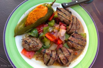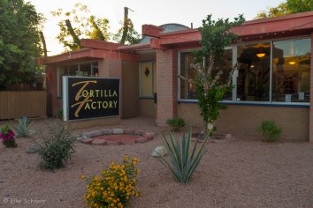 Zum Essen gehen wir in die Old Tortilla Factory. Hier gefällt uns sofort das nette Ambiente: man muss sich keiner Klimaanlage ausliefern, sondern kann draußen sitzen und wird stattdessen mit Sprühstrahlern „gekühlt“