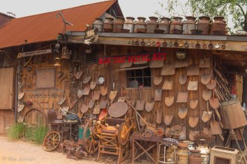Diese haben wir zwar 2012 schon einmal besucht, aber damals war es so heiß, dass wir uns kaum draußen aufhalten konnten und schon nach wenigen Minuten in den Saloon flüchten mussten. Dieses Mal ist es deutlich angenehmer. Wir sind die einzigen Besucher und können uns in aller Ruhe umschauen. Das ist der Vorteil der frühen Stunde — andererseits gibt zu dieser Zeit natürlich weder Shows, noch Touren. Die Minentour wäre sicher ganz interessant gewesen.