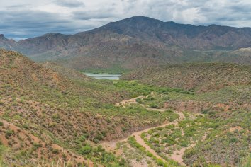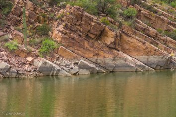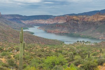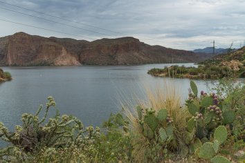 Gegen 11:00 Uhr begeben wir uns auf die Weiterfahrt entlang des Apache Trails. Dieser erhielt seinen Namen übrigens, weil die Straße einem alten Pfad folgt, den die Apache Indianer durch die Superstition Mountains nutzten. Anfang des 20. Jahrhunderts wurde die Strecke für den Bau des Theodore Roosevelt Dams als Versorgungsstraße ausgebaut — heute wird sie hauptsächlich touristisch genutzt, denn der Apache Trail führt durch eine traumhafte Landschaft: Herrliche Kakteen umrahmt von prächtigen Felsen, Canyons und Mesas, dazu die Ausblicke auf den Canyon Lake und den Apache Lake. Eine perfekte Mischung aus Wasser und Wüste, die uns alle paar Meilen zum Anhalten nötigt, um wieder ein paar Fotos zu machen.