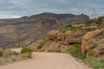 Ein paar Meilen nach Tortilla Flat endet dann der Teer und unser Auto kann jetzt auf Sandpiste und Washboard mal richtig zeigen was es kann. Die Straße ist teilweise sehr eng und kurvig, aber da wir hier ziemlich alleine unterwegs zu sein scheinen, ist das auch kein größeres Problem.