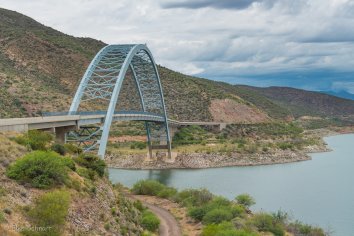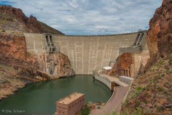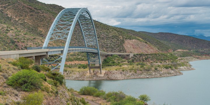 Wir benötigen für die 43 Meilen fast drei Stunden und kommen gegen 14:00 Uhr schließlich am Roosevelt Dam an. Ursprünglich im Jahre 1911 fertig gestellt, wurde er Ende des 20. Jahrhunderts erneuert und ausgebaut, als man feststelle, das der größtmögliche Wasserstand im Reservoir doch deutlich höher ist als man ursprünglich angenommen hatte.