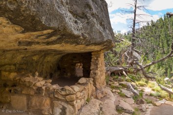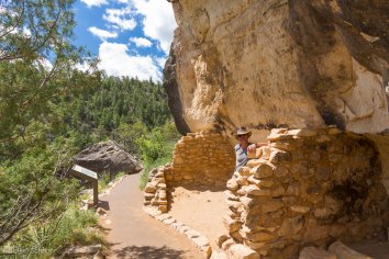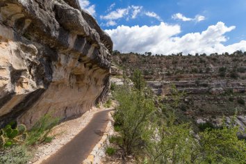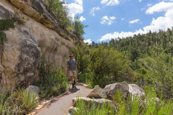 Der von alten verwachsenen Bäumen gesäumte Pfad führt über etliche Stufen steil in den Canyon hinunter. Man hat dabei immer wieder wunderbare Ausblicke und kann die alten Felsenwohnungen — bzw. was davon noch erhalten ist — anschauen. Archäologisch wirklich sehr interessant.