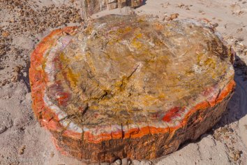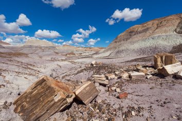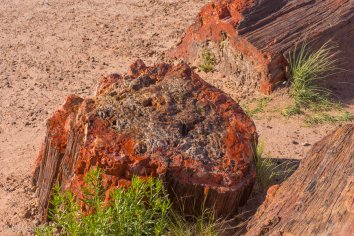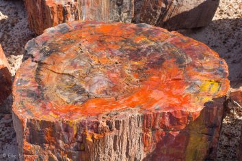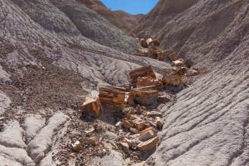 An manchen Stellen türmen sich versteinerte Holzabfälle wie in einem Sägewerk, an anderen wiederum sehen wir ganze versteinerte Baumstämme von bis zu 30 Metern Länge, an denen man sogar noch die Baumrinde erkennen kann.