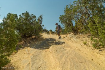 Eine amerikanische Familie mit vier kleinen Kindern, die ebenfalls dort parkt, ist offenbar deutlich schlechter vorbereitet, denn obwohl die Kinder am Parkplatz noch freudig herum springen und „Moonshine Arch, Moonshine Arch“ rufen, können wir sie später auf dem Trail nach der zweiten Abbiegung nicht mehr entdecken.