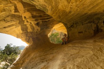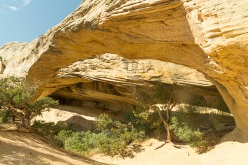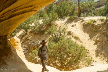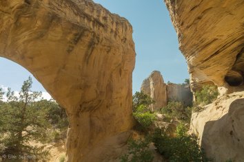 Als wir den Arch schließlich erreichen, sind wir erst mal sprachlos. So gewaltig und wunderschön hatten wir ihn uns nicht vorgestellt. Eigentlich war diese Wanderung ja nur eine Art „Lückenfüller“, weil die Sheep Creek Loop gesperrt war und nun wird sie zum Highlight des Tages. Der imposante Arch vor dem Alkoven ist ein regelrechter Multi-Arch und wir fotografieren ihn aus jeder Perspektive.