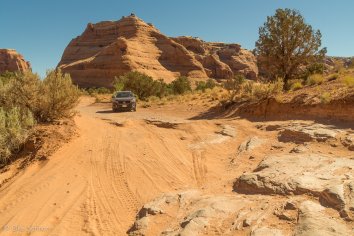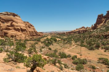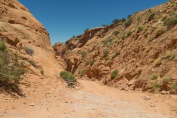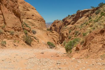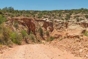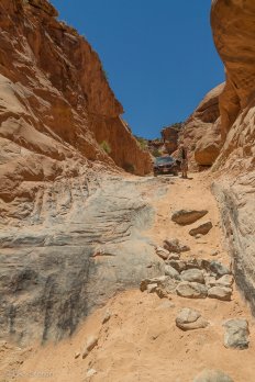 Kurz nachdem wir von der 191 in die Gemini Bridges Road abgebogen sind, kommt uns jedoch ein SUV rückwärts fahrend entgegen. Das scheint wohl nichts Gutes zu verheißen… Aber wir bleiben noch optimistisch — vermutlich wird das einfach ein Weichei sein