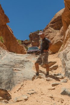 Als wir an einem kleinem Parkplatz vorbeikommen, treffen wir einen Mann, der mit seinen Kindern zu einer Jeeptour unterwegs ist und befragen auch ihn nach dem Straßenzustand auf der weiteren Strecke. Er beruhigt uns, dass wir das schlimmste Stück hinter uns hätten und zeigt uns auch noch, wie wir von hier aus direkt zum Gemini Bridges Overlook und zu den Bridges selbst laufen können.