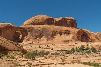 Schon recht bald kann man die beiden Felsbögen von weitem sehen: links den Bowtie Arch und rechts den Corona Arch: