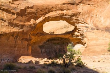 Zuerst erreichen wir den Bowtie Arch — einen Dome mit einem riesigen Loch, durch das sich interessante Perspektiven auftun. Abfließendes Wasser und damit gelöste Mineralien haben zu den streifenförmigen Auswaschungen im Sandstein geführt.