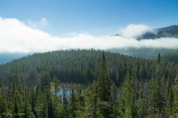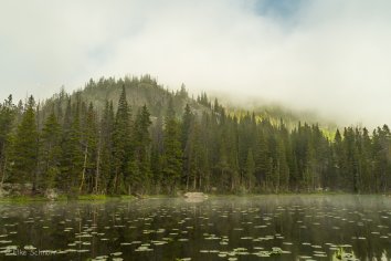 Der Weg führt zunächst am Nymph Lake vorbei, der noch etwas im Nebel liegt. Man kann aber schon spüren, wie die Sonne drückt und etwas weiter oben ist von dem Dunst kaum noch etwas zu sehen.