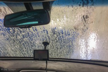 Im Gegensatz zu Deutschland, wo man das Auto in der Waschanlage ja verlassen muss, bleiben wir hier beim Durchfahren im Auto sitzen und können so genau beobachten, wie der ganze Dreck weggespült wird