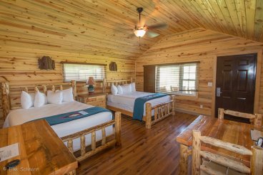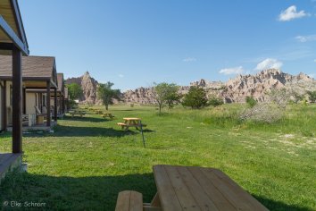 Gegen 16:00 Uhr checken wir in der Cedar Pass Lodge ein. Auf den ersten Blick eher unscheinbar, entpuppt sich die Lodge als ein echtes Schmuckstück. Die rustikalen Cabins sind ziemlich neu und echt genial. Jede Cabin hat zwei Verandas mit tollem Ausblick — eine für den Sonnenaufgang und eine für den Sonnenuntergang. Uns gefällt es hier richtig super.