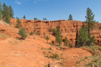 Unterwegs haben wir ständig wechselnde Sichten auf den Berg, aber auch schöne Ausblicke auf die liebliche Landschaft und auf rote Steine, die offenbar die Namensgeber des Trails sind.
