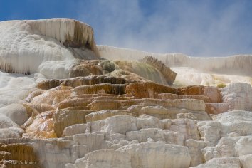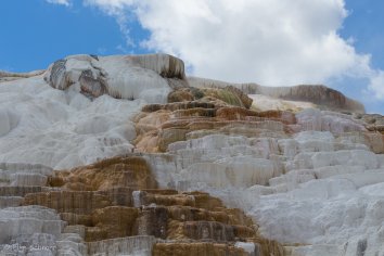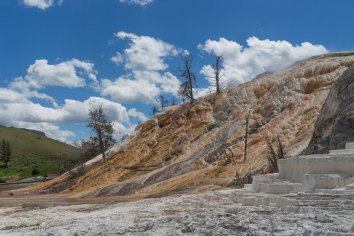 Hier schauen wir uns am Nachmittag die Sinterterrassen an und laufen zuerst den Boardwalk auf der Upper Terrasse Loop ab, wo es natürlich deutlich belebter ist als auf unserer Wanderung von heute Morgen.