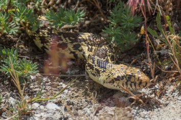 Neben den farbenfrohen Sinterterrassen gibt es aber auch völlig unerwartetes Wildlife zu sehen: unter den Holzplanken kriecht diese riesige Bullennatter hindurch: