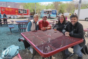 Auch wenn es immer noch Hunde und Katzen regnet, verbringen wir eine schöne Zeit mit den beiden zusammen — sitzen zuerst im Foot Truck Park und flüchten als es immer nässer wird, in die Bar der Moab Brewery. Wir haben uns lange nicht gesehen und entsprechend viel zu erzählen, so dass die Zeit verfliegt wie im Nu.