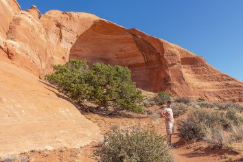 Als Nächstes halten wir noch einmal am Looking Glass Arch. Dort waren wir zwar vor drei Tagen schon, aber wir wollen noch einmal auf die andere Seite und den Arch umrunden. Dafür hatten wir beim letzten Mal nicht genügend Zeit. Und das lohnt sich unbedingt, denn von der anderen Seite aus sieht man erst den riesigen Alkoven, den man von der Vorderseite gar nicht erahnen kann.